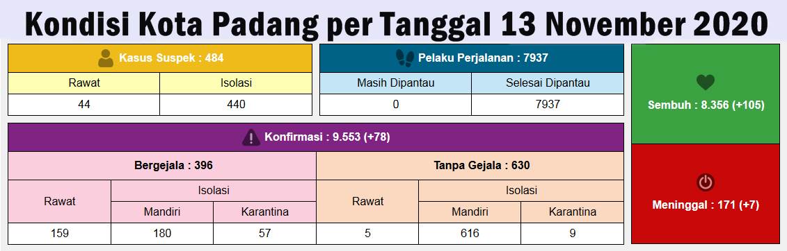 Hasil pemeriksaan kasus Suspek dan Pelaku Perjalanan di Kota Padang yang diperiksa laboratorium per tanggal 13 November2020 terdapat 78 kasus baru;